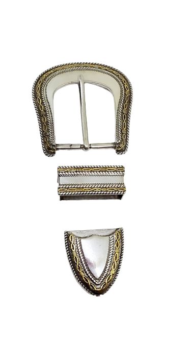 Placa de prata antiga polida com detalhes em arame farpado em placa de ouro. Adapta-se a correias de 1-1 / 2 ".