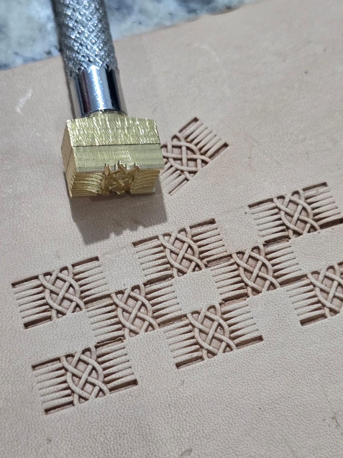 Descrição: O Pino de Latão P081 é uma ferramenta de estamparia (stamping) desenvolvida para artesãos que trabalham com estilo Western e acabamentos geométricos. Seu design apresenta um nó central entrelaçado ladeado por linhas horizontais, permitindo a criação de texturas ricas e profundas no couro atanado.