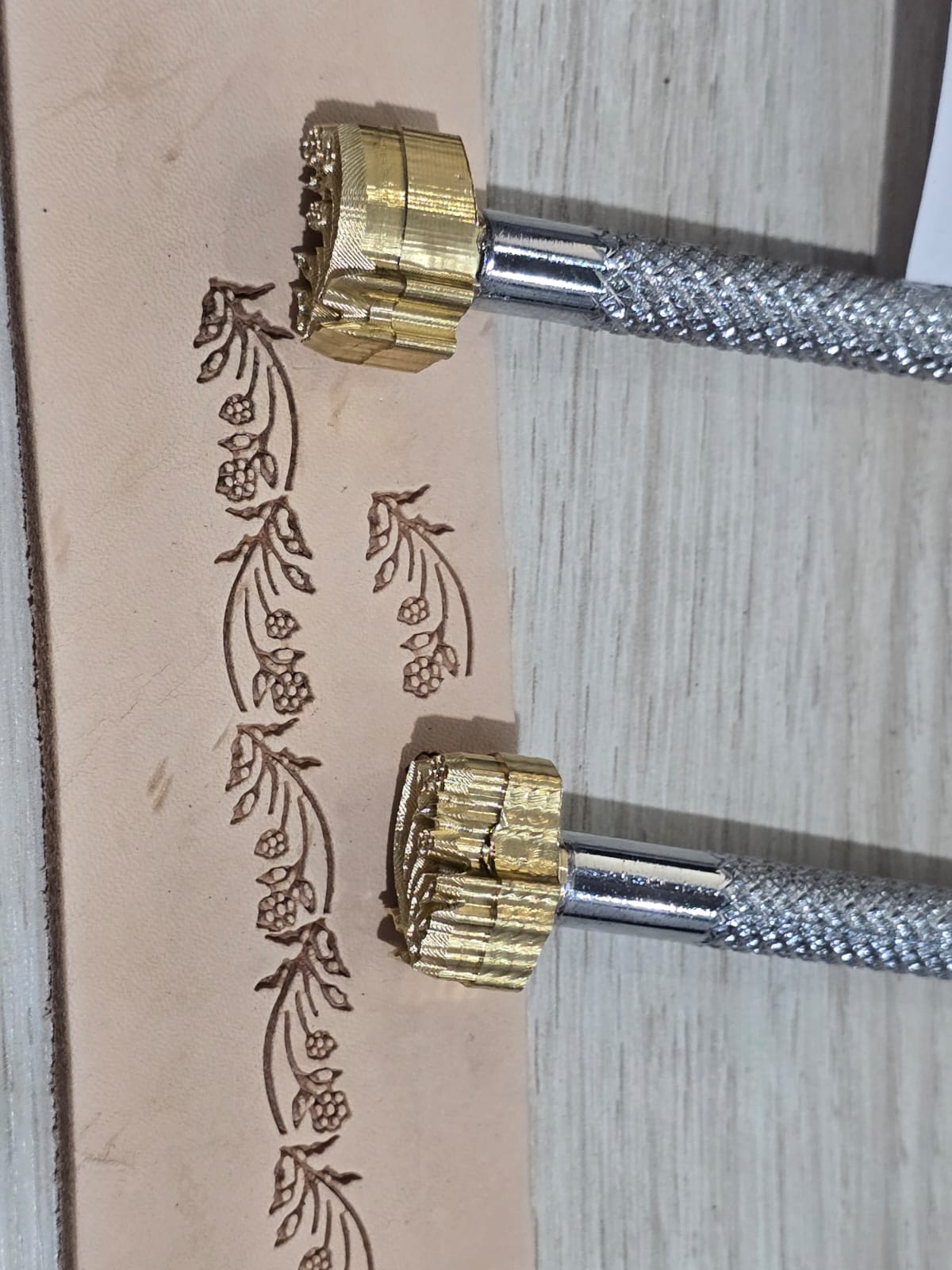 Descrição do Produto: O conjunto P438 é composto por duas ferramentas espelhadas (par), desenvolvidas para artesãos que buscam criar padrões ornamentais simétricos em couro atanado. Seu design apresenta ramos delicados com textura de frutos, proporcionando uma gravação profunda e rica em detalhes.