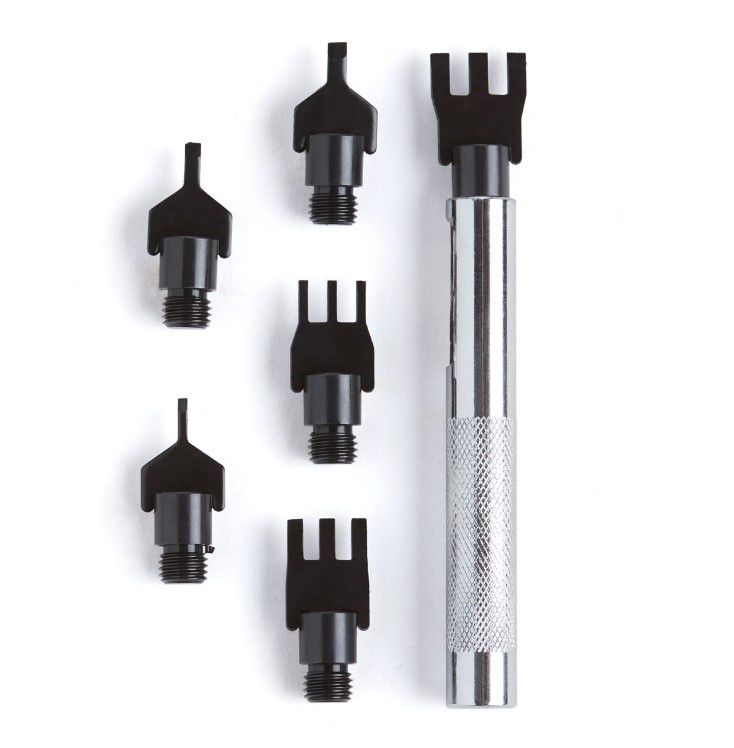 Este conjunto de cinzel de tanga é feito de aço temperado. O conjunto de modelos profissionais inclui tubos de cinzel para perfurar fendas de 1/16", 3/32" e 1/8", cinzel de um e três pinos para cada tamanho de fenda e uma alça de troca fácil. Seis ferramentas em uma. Use Poundo Board ou Poly Tábua de corte como base para perfurar. Isso ajudará a proteger suas ferramentas e o tampo da mesa.